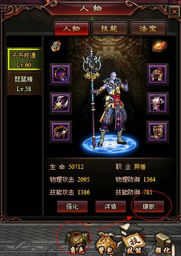 点击打开角色面板,点击“镶嵌”按钮,即可进入镶嵌面板。