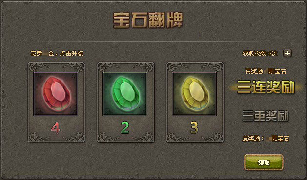 3. 每种牌分别代表能领取不同数量的宝石,可通过升级翻牌来达成“三连”或“三重”获取翻倍奖励。