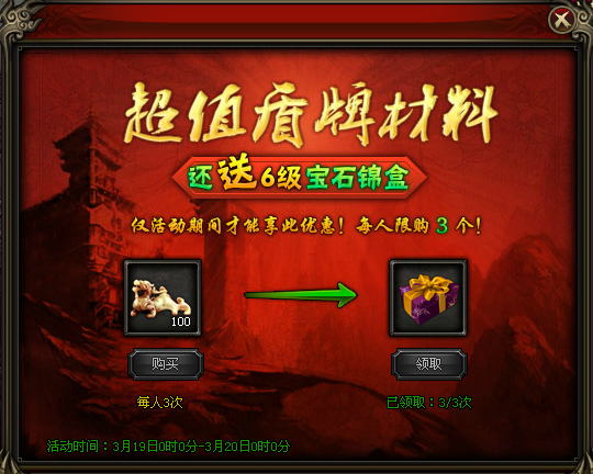 活动期间,当玩家佩戴对应等级的盾牌,盾牌材料箱,可在活动中兑换界面兑换超值限时或者不限时道具