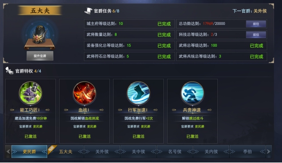 玩家们在游戏中可以升级自己的官爵,解锁不同的特权,官爵等级越高,特权解锁的越多,官爵解锁条件全部达成后可提升官爵,官爵不同,完成的条件也不同。官爵特权激活需要消耗对应道具。