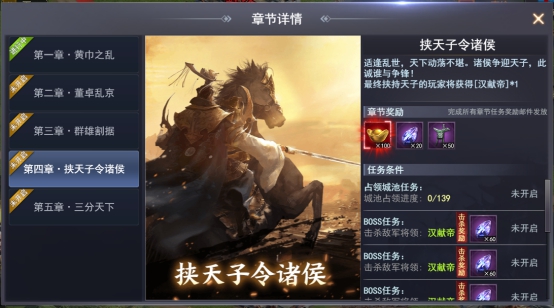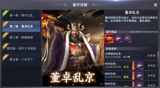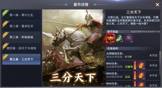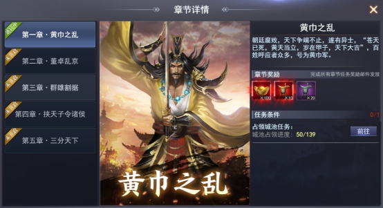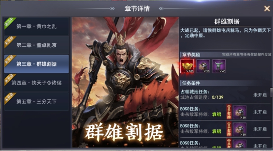 为了丰富游戏玩法,帮助玩家前期获得更多资源材料,设计了国战玩法,国战共分5个章节:第一章·黄巾之乱、第二章·董卓乱京、第三章·群雄割据、第四章·挟天子令诸侯、第五章·三分天下