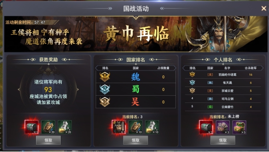 2、 若活动结束前,玩家占领所有黄巾城市,玩家获胜,次日黄巾军提升1级;若玩家失败,次日黄巾军等级降低5级
