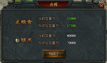 仓库是储存粮食 和 银两的地方,仓库等级越高,可储存的钱粮数量越多,仓库内粮食和银币可以通过 民户 和 工坊 等获得。