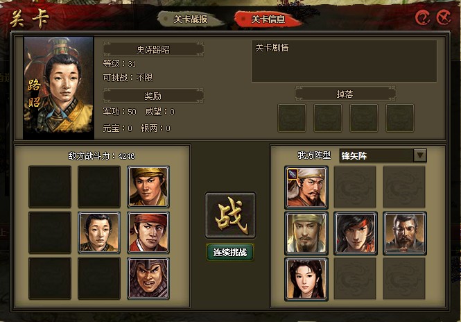 点击进入一个关卡进行挑战,可以查看对方的布阵、战力和掉落情况,调整自己的布阵,还可以在关卡战报界面查看其他玩家的战报。