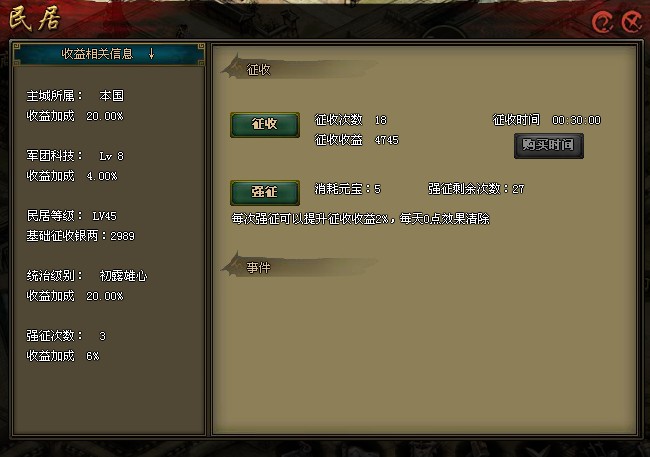 当玩家加入一个国家阵营后将会搬迁到该国的一座城池,玩家将会获得自己的居民。同时,玩家的封地中将会增加建筑【民居】。在民居处,玩家每天可以征收银两,民居等级越高,征收获得银两也会越多。
