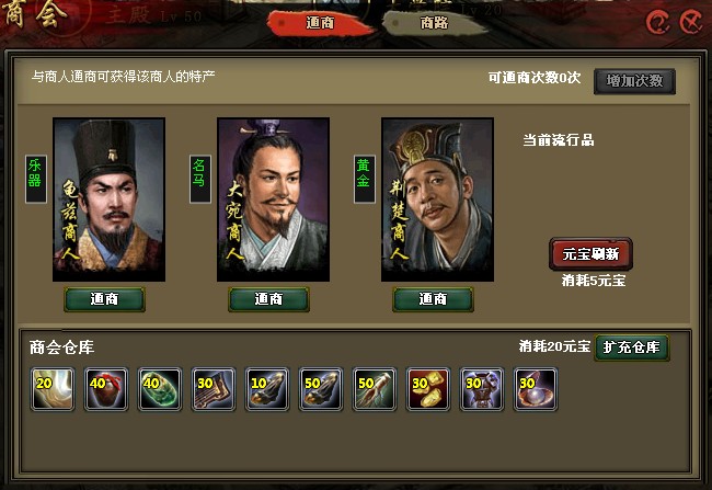 玩家每天可以获得通商次数,在商会界面与各路商人进行贸易通商获得他们的商品。得到商品后可以在商路中卖出。初期玩家只能在本城中卖出,当商会等级提升后会开启额外的商路,玩家可以与其它玩家建立商路,拥有更多的出售选择。