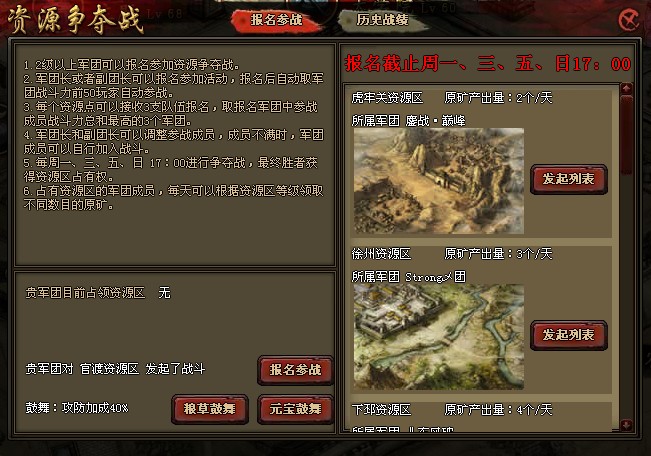 报名后将自动读取战斗力前50名的玩家进入资源争夺战,团长可以调整参加的玩家。参与争夺战的玩家可以进行鼓舞。