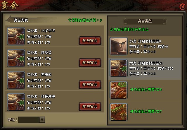 在宴会界面可以选择4种宴会的豪华程度。开办宴会需要VIP等级,越大的宴会需要越高的等级开能开办,获得的威望也越多。开办宴会后可以请军团的朋友来参加,参加的人可以获得军令。每次宴会可以有5个人参加,人数满5人后就可以开启宴会,人数不足时可以花费元宝强制开启。每个人每天只能参加或举办2次宴会。