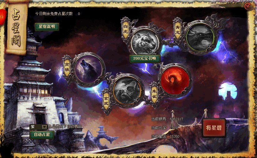 占星阁乃占卜星宿之地,星宿可以大幅提升武将的各项能力。占卜需要花费银两,但是每天前3次的占星是免费的,千万不要错过。占卜从贪狼星开始,每次占卜都有可能开启能高级的星宿,玄武、朱雀、白虎、青龙星宿被激活时可以点击它们占卜,有可能获得品质更好的将星。