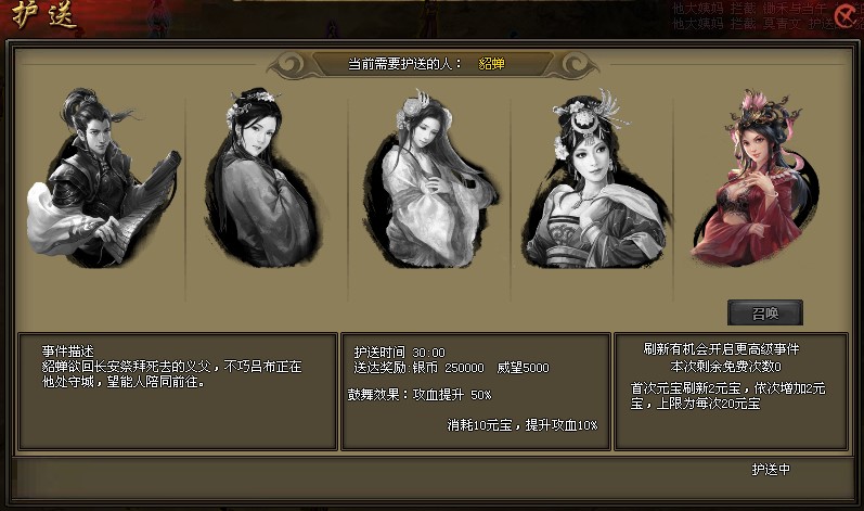 进入护送活动后可以选择要护送的NPC。NPC有马谡、小乔、张春华、甄姬、貂蝉,奖励依次提升,护送貂蝉高可以获得5000威望、25万银两奖励。每次护送都会随机出现一个需要护送的NPC,如果不满意可以进行刷新重选。每天有3次免费刷新的机会。