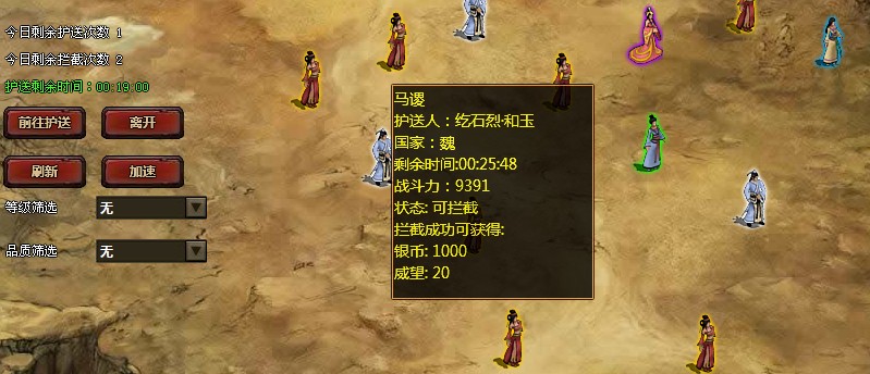 护送期间界面上会显示正在护送中的NPC及护送的玩家信息,点击NPC可以进行拦截。如果拦截成功可以获得该玩家的部分奖励。玩家每天有5次拦截机会,需要注意玩家之间等级相差较大时拦截无法获得奖励。