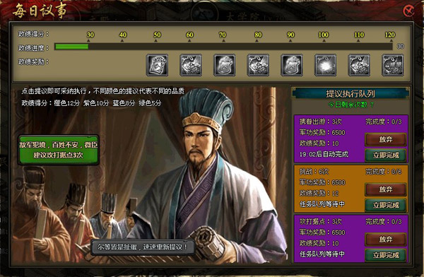 每天可以完成10个政务议事的内容,每个提议完成后都可以获得政绩和军功的奖励。点击下方的重新提议按钮可以刷新提议,点击提议接取任务。接取后的任务会显示在右侧,玩家可以根据提议的内容完成它,也可以等20分钟自动完成。