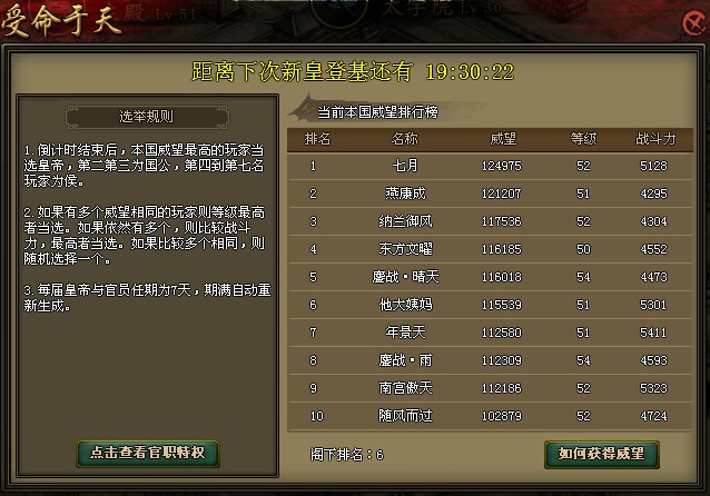 游戏中每隔一周会选出每个国中威望高的玩家将当选为皇帝。皇帝可以享受攻防和兵力加成、迎娶7个家眷、册封国公诸侯等特权。重要的是皇帝可以对敌方城池发起攻城战。每个国家占领的城池越多,该国玩家就可以获得更多的利益。