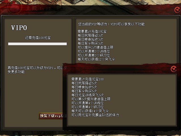 | 0级VIP | 0 | 每日民居强征3次 每日粮食抢收3次 每日军令购买3次 可以提升2次建造队列 可以开通第3个训练位 可以开通第3个研习位 每天可以获得12个突飞令 |