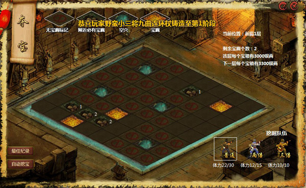 在夺宝界面玩家可以选择一支挖宝队伍进行挖掘,挖掘后会显示该格和周围有多少宝藏,类似扫雷。使用更高级的挖宝队挖到宝藏格可以获得翻倍的银两,所以秦陵夺宝也是一个脑力活动哦!