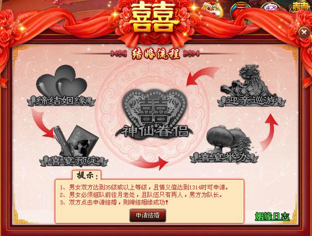 ·缔结姻缘后可继续进行喜宴预定、喜帖发放、喜宴举办、迎亲巡游和神仙眷侣活动。