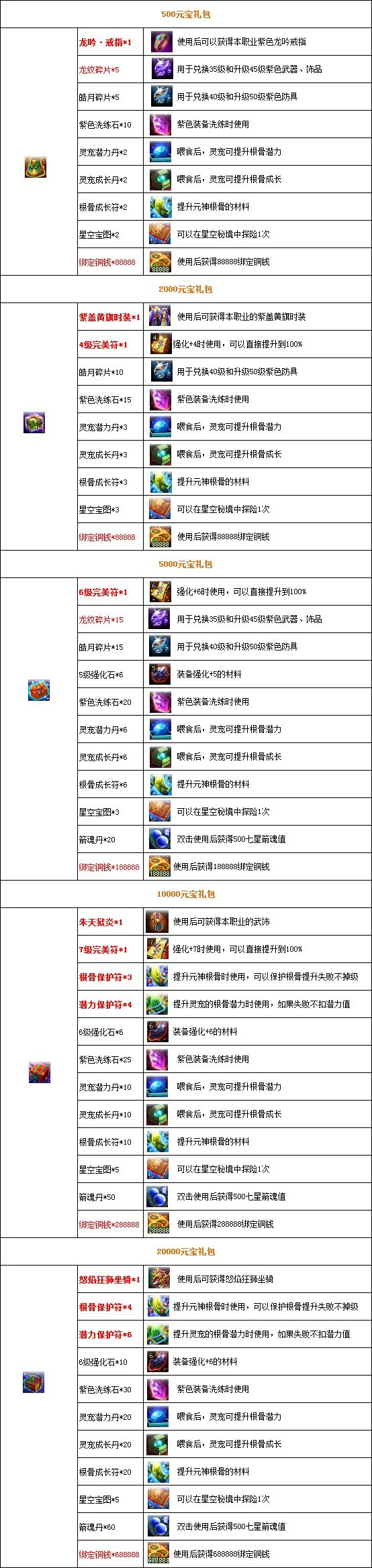 【活动规则】活动时间内,玩家累计充值达到指定元宝,即可获得以下丰厚奖励。