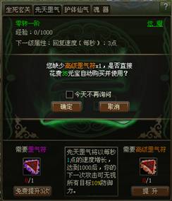 【活动说明】在 角色-修炼境界-先天罡气和护体仙气 界面使用元宝快速购买高级罡气符、高级仙气符(原价50元宝)升级可以享受价格7折优惠(直接使用材料升级无法享受折扣)