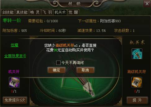 【活动说明】在 技能-机关术 界面使用元宝快速购买高级机关符(原价50元宝)升级可以享受价格7折优惠(直接使用材料升级无法享受折扣)