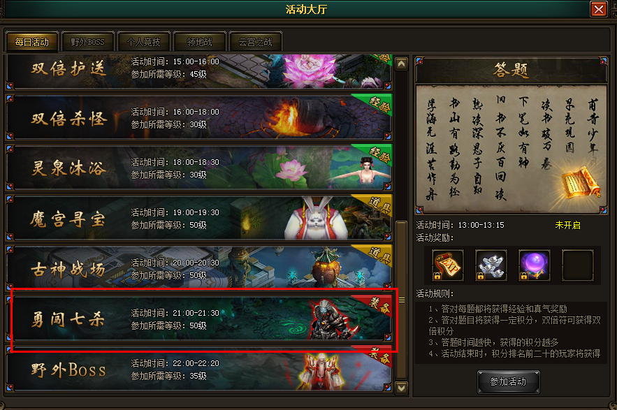 全新玩法勇闯七杀活动定时开启。届时玩家可以通过活动大厅或界面飞出的小图标进入。