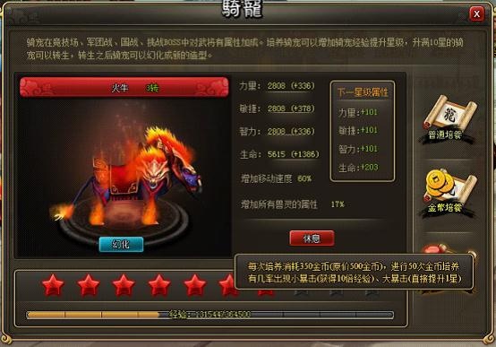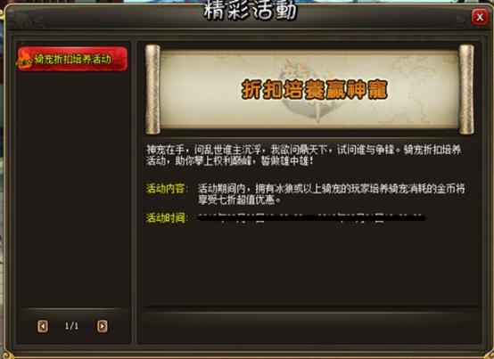 活动内容:神宠在手,问乱世谁主沉浮,我欲问鼎天下,试问谁与争锋。骑宠折扣培养活动,助你攀上权力巅峰,誓做雄中雄!活动期间,拥有冰狼或以上骑宠的玩家培养骑宠消耗的金币将享受七折超值优惠。