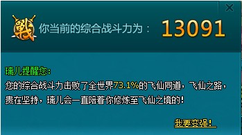想了解你在全飞仙世界中的大致实力排名吗?现在每日次登陆,璃儿就会告诉您,您当前在全世界数千组飞仙服务器,数百万飞仙仙友中的战斗力排名,您可以清楚的知道自己击败了多少仙友,拥有更明确的目标。