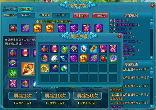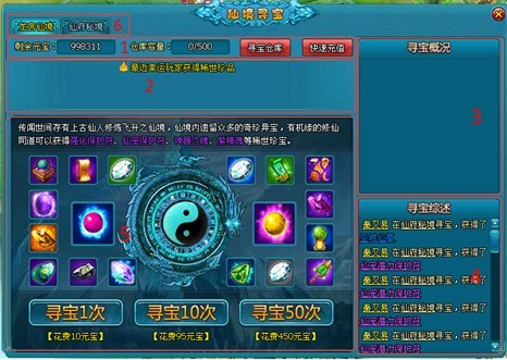 区域5:仙境寻宝中可能出现的一些物品以及寻宝1次、10次、50次的按钮,在按钮下方显示对应需要花费的元宝数量。