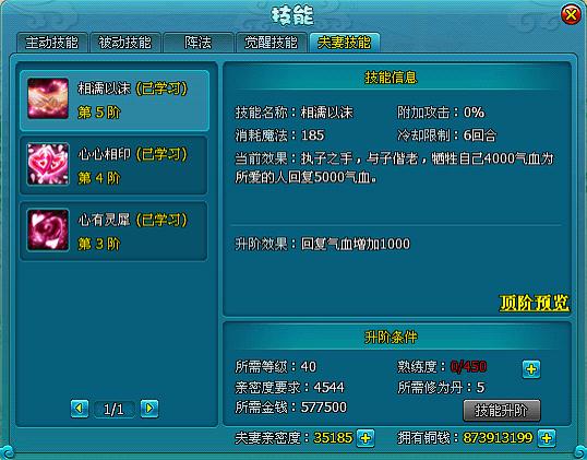 当获得夫妻技能后,攒够足够的亲密度与熟练度还可继续升级,提高技能效果。