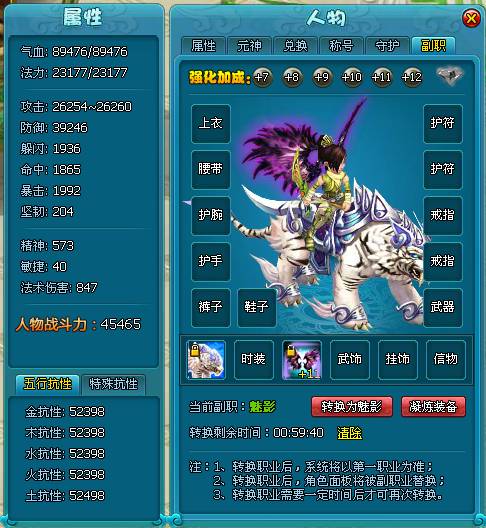 1. 一旦选择好副职后不可更换,选择好副职业后,副职面板变为对应副职的面板,副职除了坐骑、翅膀、挂饰、信物外无穿戴任何装备。如下图: