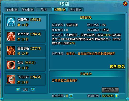 4. 变成副职业后,可以学习副职业的技能并使用副职业的技能,副职业的抗性技能、通用阵法、觉醒技能、夫妻技能保留等级,如下图: