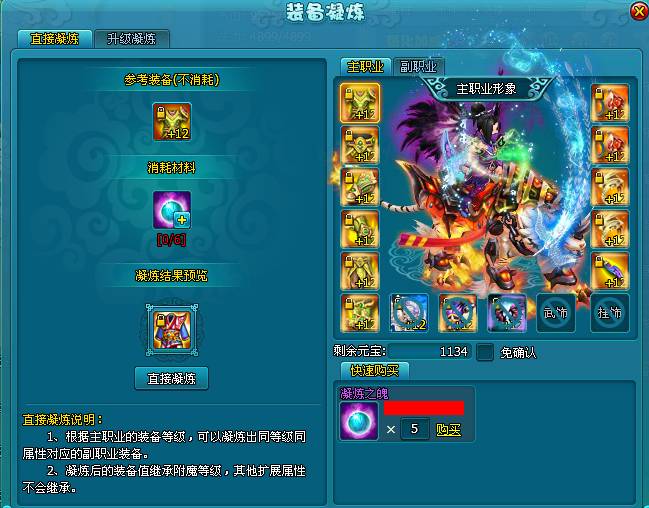 玩家可以消耗一定数量的凝炼之魄,凝炼对应等级的第二职业的同部位装备,直接凝炼只继承原装备的附魔等级,不继承强化等级、洗炼属性、装备品质、装备神佑等属性。