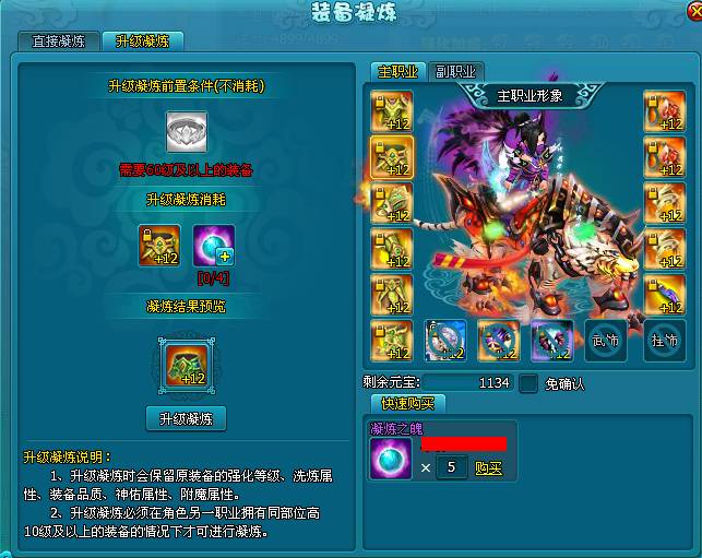 2.升级凝炼:在职业拥有高等级橙装的条件下,第二职业可以将原有的装备升级,如下图: