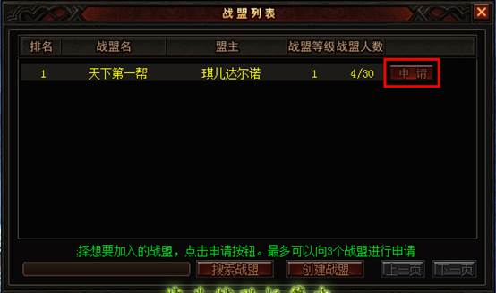 Ø 未加入战盟的角色会打开战盟列表。在战盟列表中点击所选战盟后的申请按键可申请当前以选择的战盟。