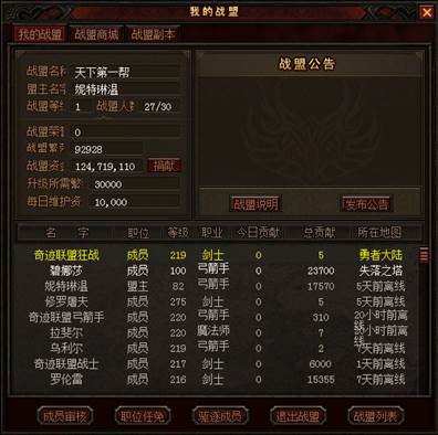 资金捐献:战盟所有成员可点击捐献按键对战盟进行捐献,10000金币=1贡献。战盟资金可以用来升级战盟、开启战盟副本。贡献可用于在战盟商城兑换道具。