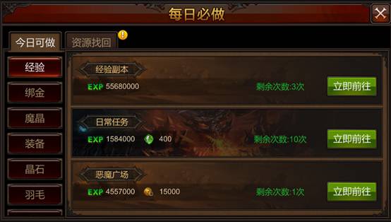 点击每日必做按钮,面板上会将游戏类各项产出点根据分类显示在相应的界面中,玩家可通过该面板查看其每日可完成和未完成的任务