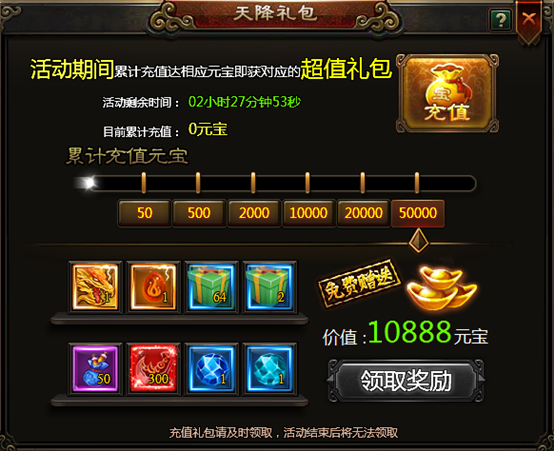 活动期间,累计元宝充值达到一定时,即可领取对应档次的充值大礼包(每个档次的礼包最多领取一次)