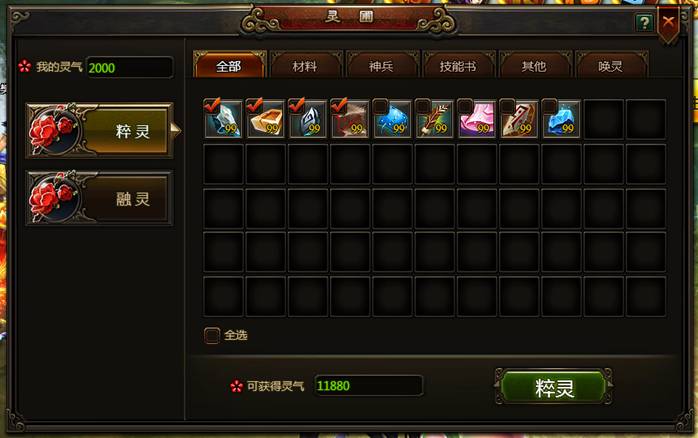 VIP4以上的玩家,可以再材料不足时,通过元宝来补齐材料。不过,灵气不足的话,还是请先粹取灵气吧!