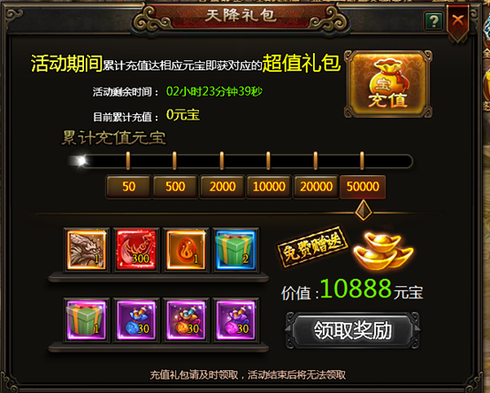 活动期间,累计元宝充值达到一定时,即可领取对应档次的充值大礼包(每个档次的礼包最多领取一次)