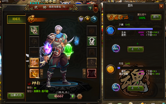 点击“注入”可以使用相应的星阵碎片培养星阵,星阵升级后将增加更多的属性;