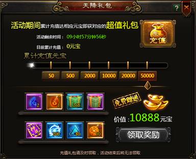 1、活动期间,累计元宝充值达到一定时,即可领取对应档次的充值大礼包(每个档次的礼包最多领取一次)