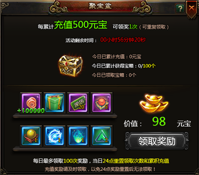1、 活动期间,每累计充值500元宝即可领取一次奖励