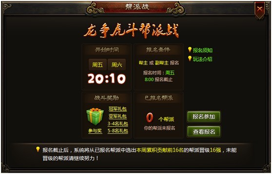 一、队伍筛选:报名结束后由系统筛选出报名队伍中本周累计贡献最多的16个帮派参加帮战,没有获得参赛资格的帮派要加油!