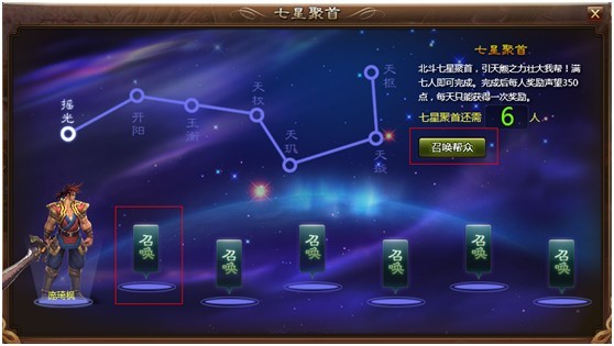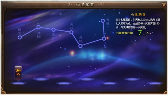 玩家每天次加入七星聚首可以获得声望,之后的进入都会以协助聚首的身份加入。同在一个帮派,应该要相互协助共同完成这个需要集合7人之力的任务,方能展示帮内的团结和互助。