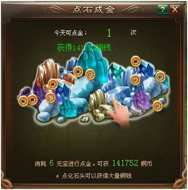 点石成金是爱奇艺神将三国的特色玩法之一,使用鼠标点击石头,即可获得大量铜钱。