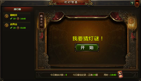 1、 每天可以参与5轮猜灯谜游戏(只有首轮可获得铜钱、精魄等奖励)