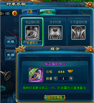 更新之后,时装衣橱里,海盗套装和泳衣套装增加“快速购买”功能。所有时装增加“快速使用”功能,可快速使用背包中的时装卡。