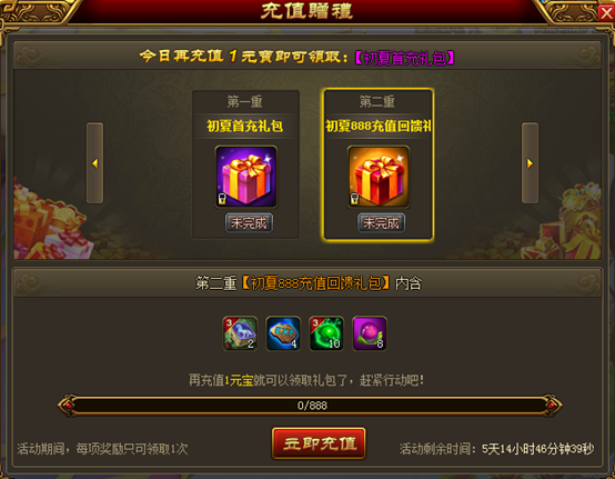 2、累计充值元宝达到888,即可领取【初夏888充值回馈礼包】×1(绑定);