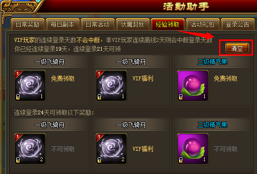 在『活动助手–经验领取』界面点击左上角“清空”按钮,即可消耗5不绑定元宝将连续登录天数清零,方便修士们免费领取或购买之前的连续登录奖励。