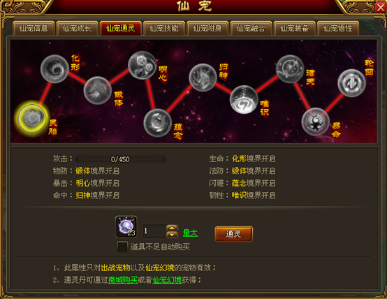 注:1、仙宠通灵的属性只对出战宠物已经仙宠幻境的宠物有效;