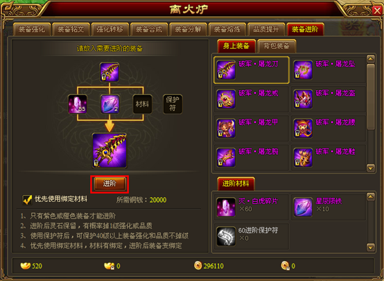 4、 点击【进阶】按钮即可将低级装备进阶为高一级装备。